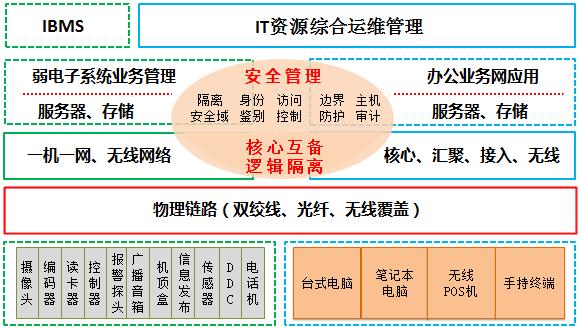 一機一網(wǎng)的智簡架構(gòu),弱電系統(tǒng)IP網(wǎng)和辦公業(yè)務(wù)網(wǎng)各自組網(wǎng),核心交換機互聯(lián)互通互為冗余備份,通過訪問控制策略實現(xiàn)安全域之間的安全隔離。
